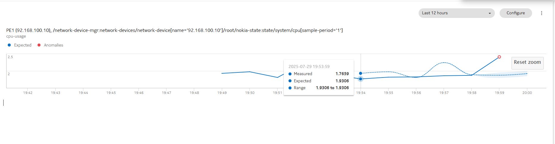 By comparing the current metric value to the expected baseline using the Z-Score, NSP can highlight anomalies. These are shown visually in the WebUI (red dots vs dotted baseline) and can trigger alerts for operator action.
