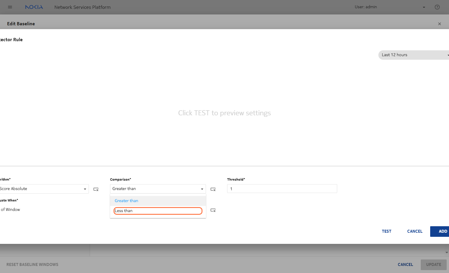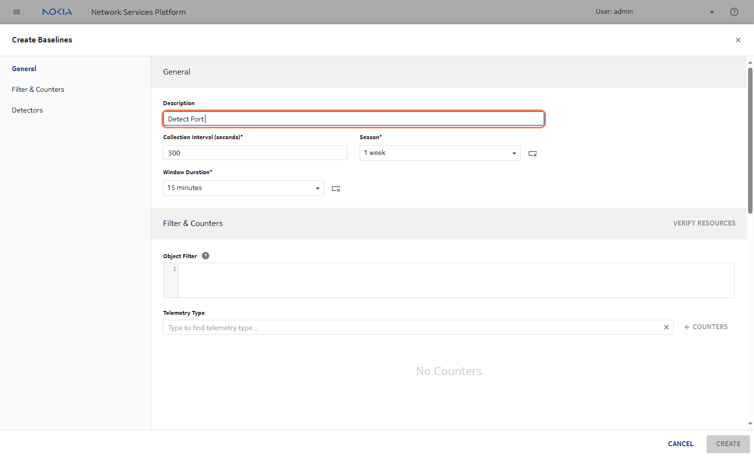 • Edit the baseline created: Add a detector with the information provided above.