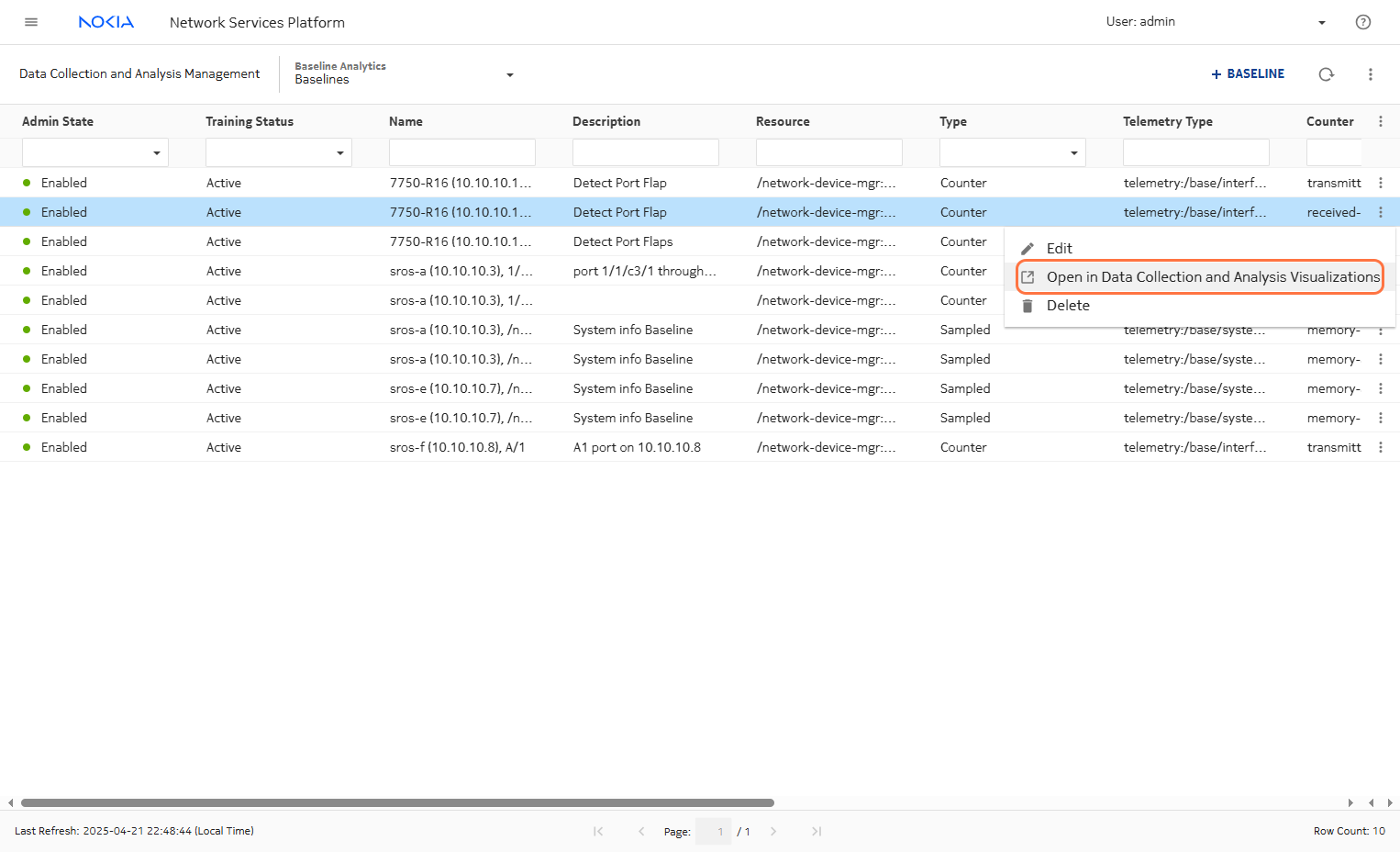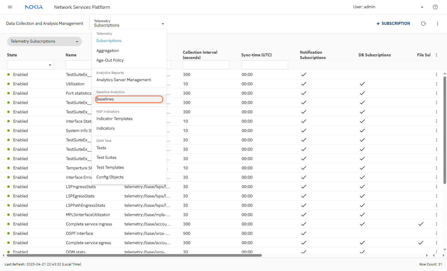 Login to NSP WebUI and navigate to Data Collection and Analysis Management and then Baselines.