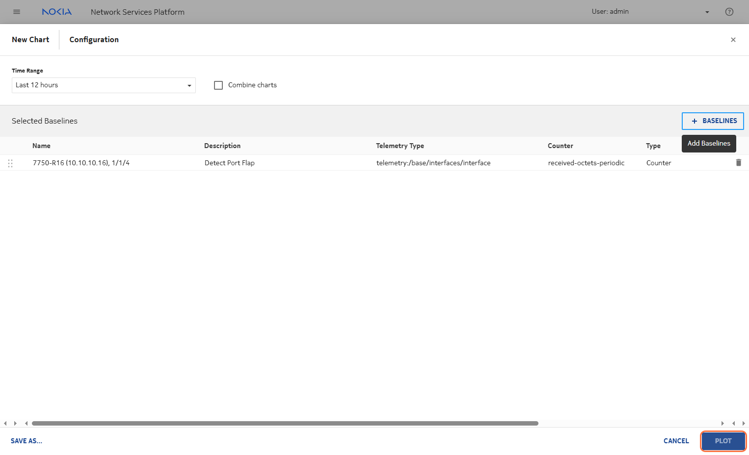 Now, click on + BASELINE on the top right of your screen to create a baseline on your pe1 node. Use the following information to fill in the required form: